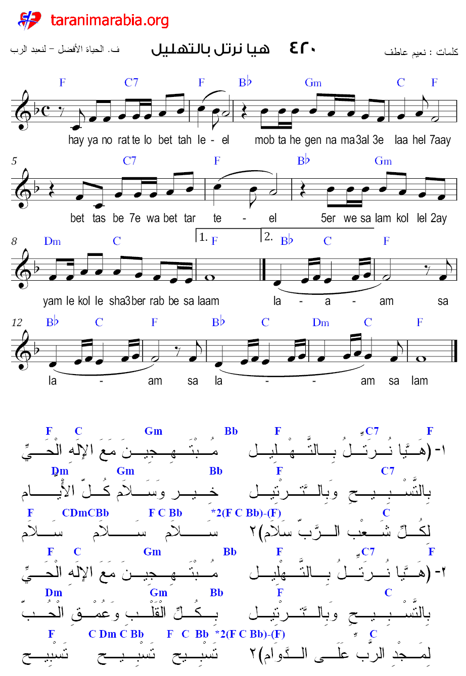 ١- (هيا نرتل بالتهليل.. مبتهجين مع الإله الحيّبالتسبيح وبالترتيل.. خير وسلام كل الأياملكل شعب الرب سلام)٢سـلام سـلام سـلام٢- (هيا نرتل بالتهليل.. مبتهجين مع الإله الحيّبالتسبيح وبالترتيل.. بكل القلب وعمق الحبلمجد الرب على الدوام)٢تسبيح تسبيح تسبيح
